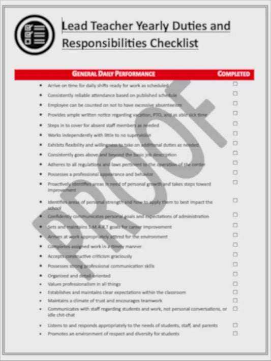 Lead Teacher Daily and Yearly Duties and Responsibilities Checklist