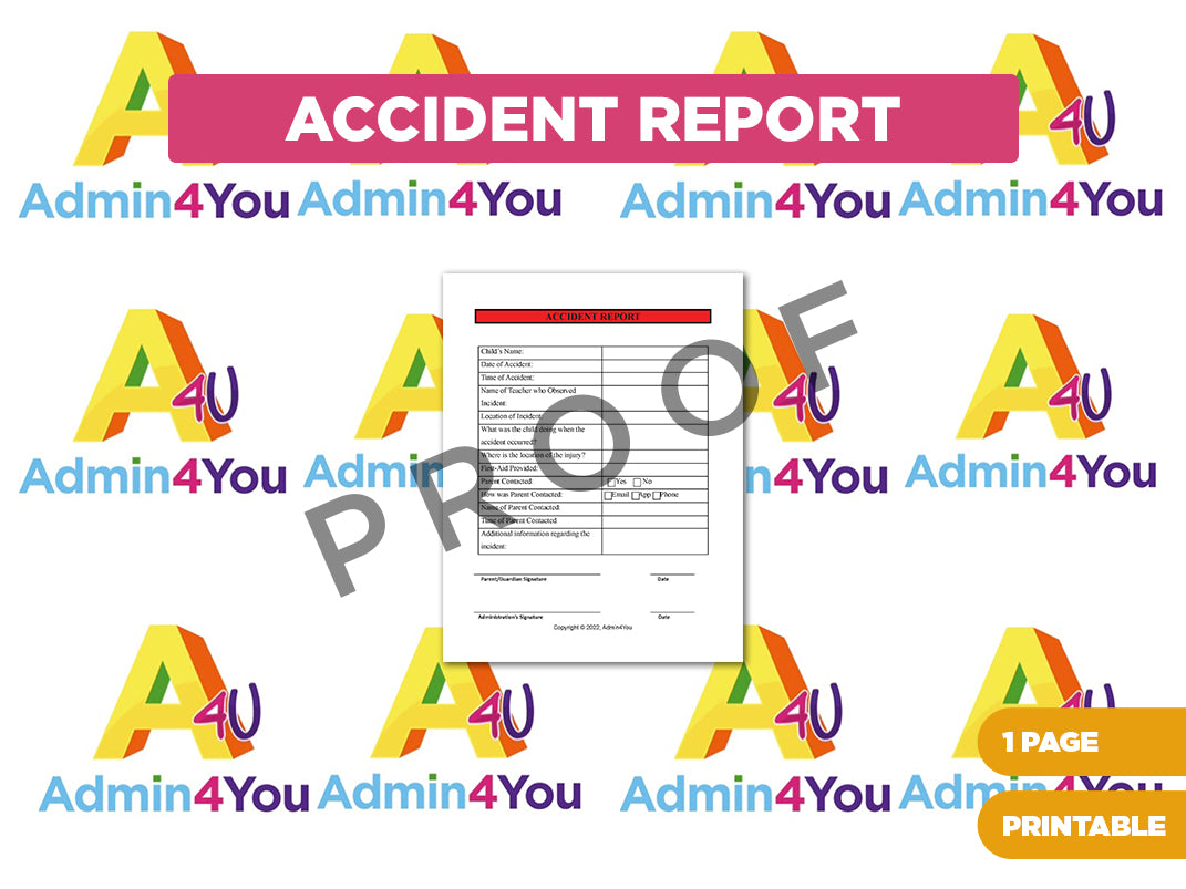 If a child or a staff member receives an injury while at school, an accident report is completed. The report includes information regarding the time and date of the injury, what happened, how it was treated, and the signature of the witnessing teacher.