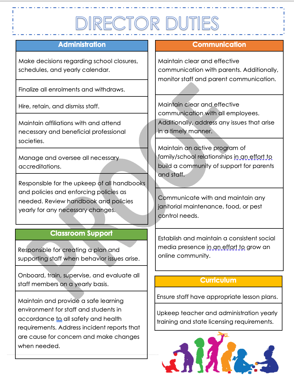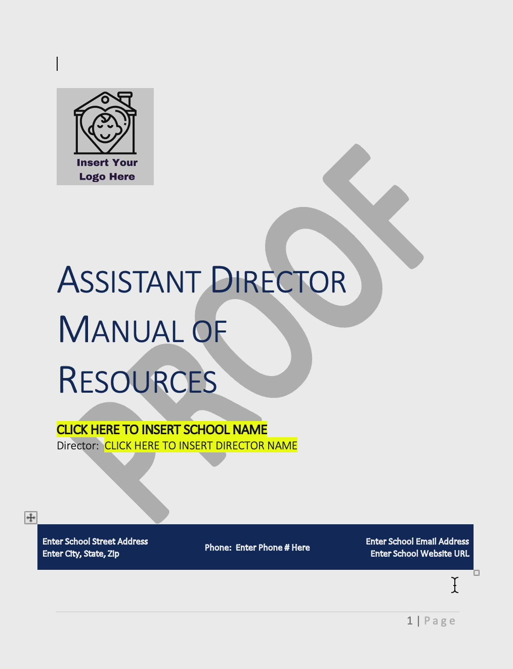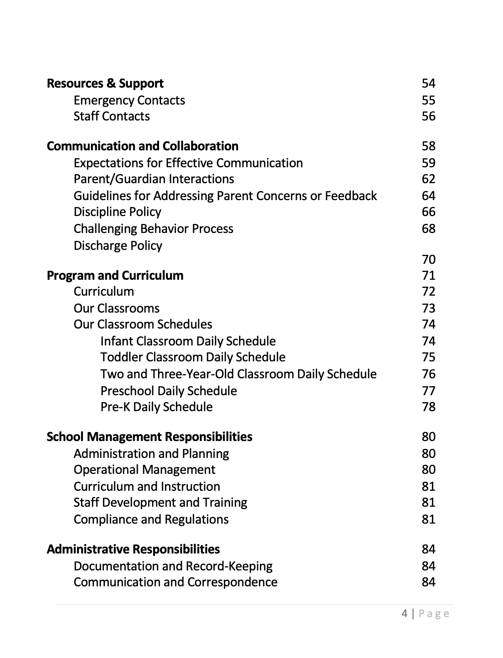 This comprehensive binder encompasses a wide array of essential policies, guidelines, and procedures, which effectively govern the center's daily operations, safety protocols, and overall management. The binder serves as a valuable tool that ensures consistency, compliance, and efficient childcare center management, ultimately fostering a secure, nurturing, and well-structured environment for the children under your care.