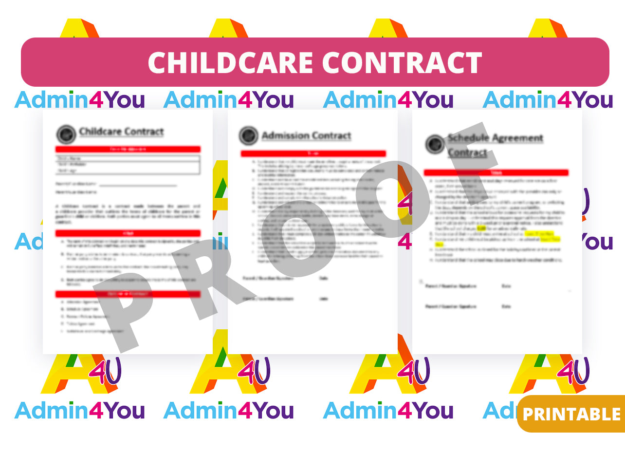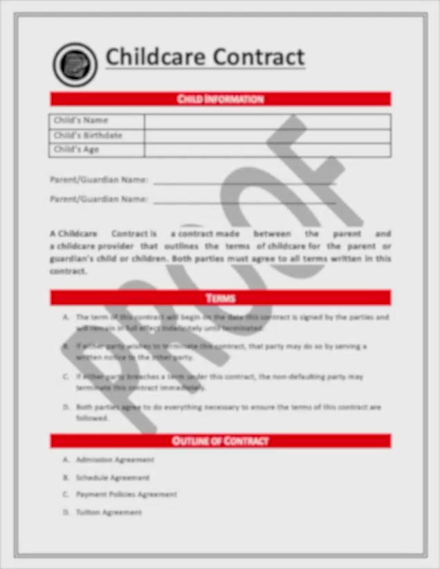 A Child Care Contract is a contract made between the parent and a childcare provider that outlines the terms of childcare for the parent or guardian's child or children. Both parties must agree to all terms written in this contract.