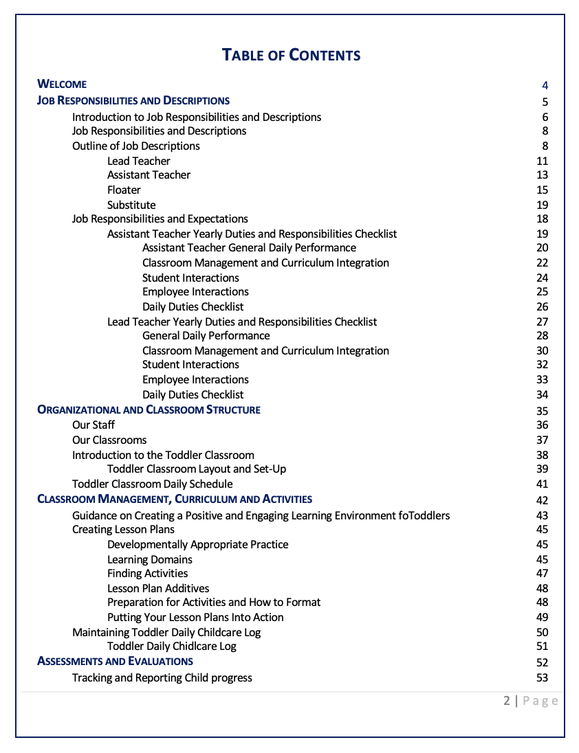 This thoughtfully curated resource is more than just a manual – it's a trusted companion for educators, providing essential information, resources, and tools to navigate daily activities confidently. Tailored to meet the specific needs of toddler classrooms, our binder ensures that teachers are well-equipped to understand and embrace the routines and expectations of their new role.