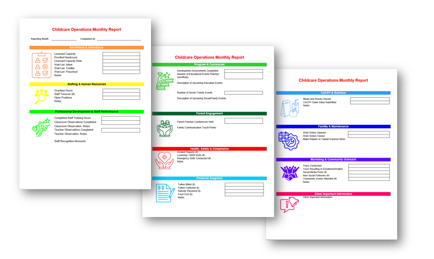 An easy way to capture every key metric your center needs - ready to print, fill in, and file.