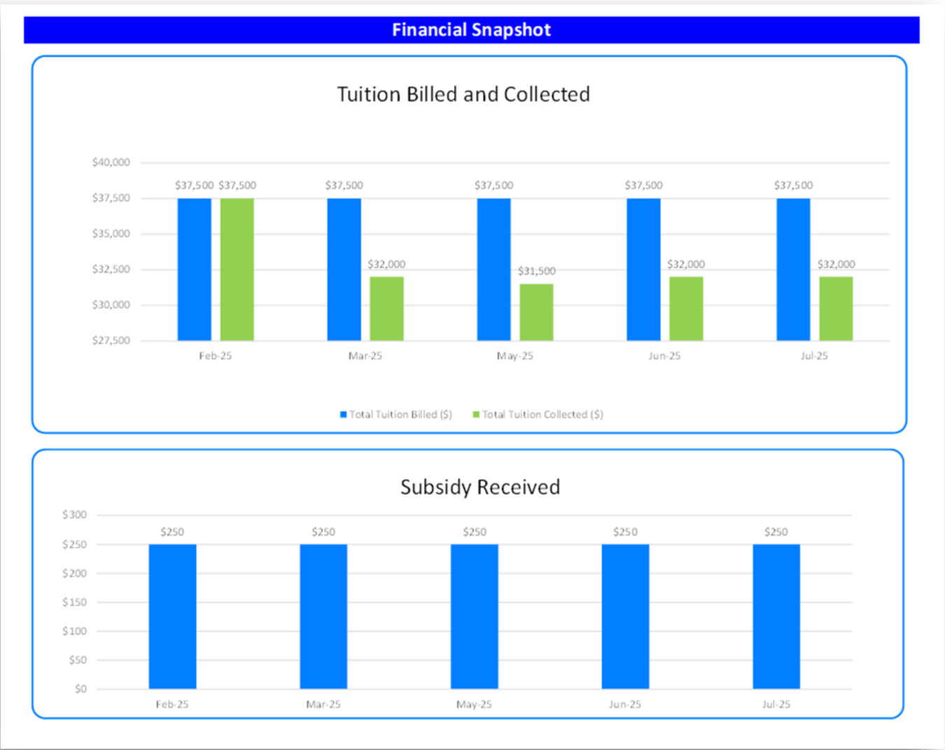 · Financial Snapshot: Tuition billed/collected, subsidies, food cost