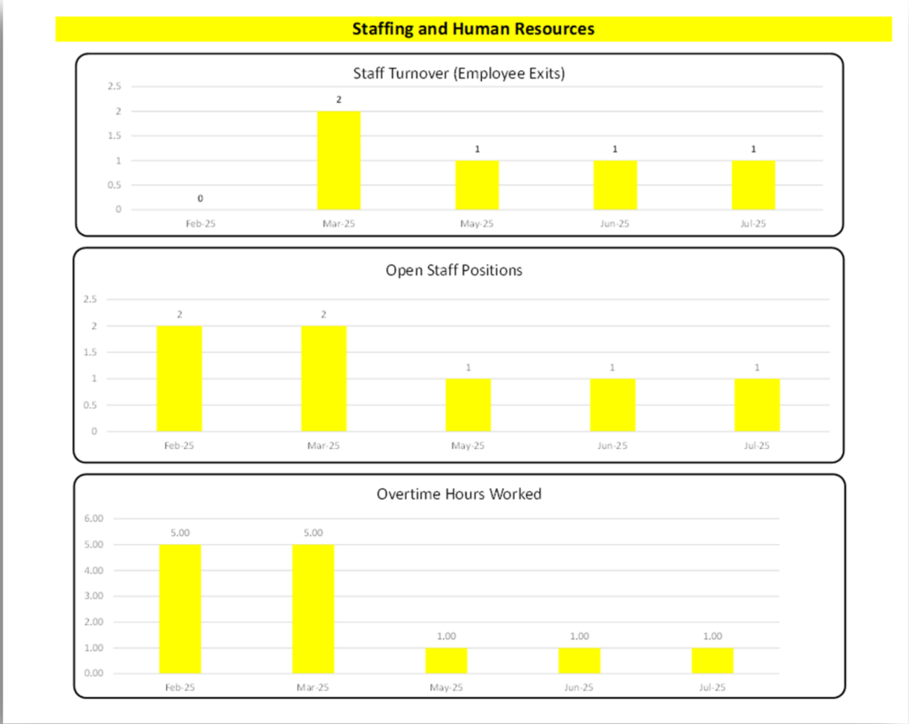· Staffing and Human Resources: Overtime, turnover, open positions, notes