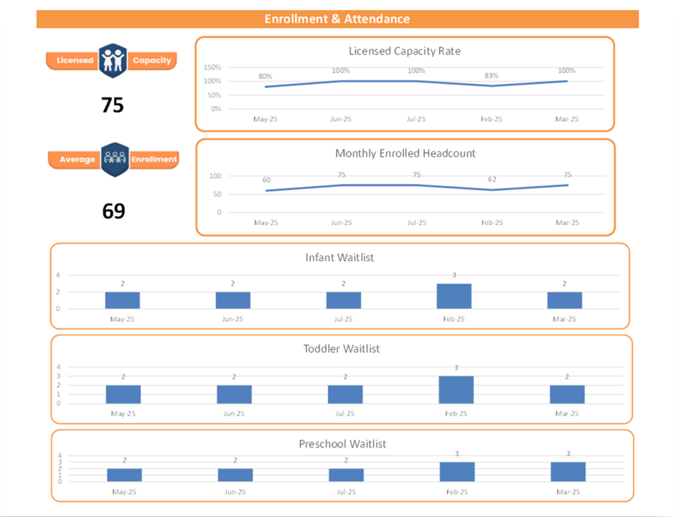 · Enrollment & Attendance: Licensed capacity, headcount, wait‑lists