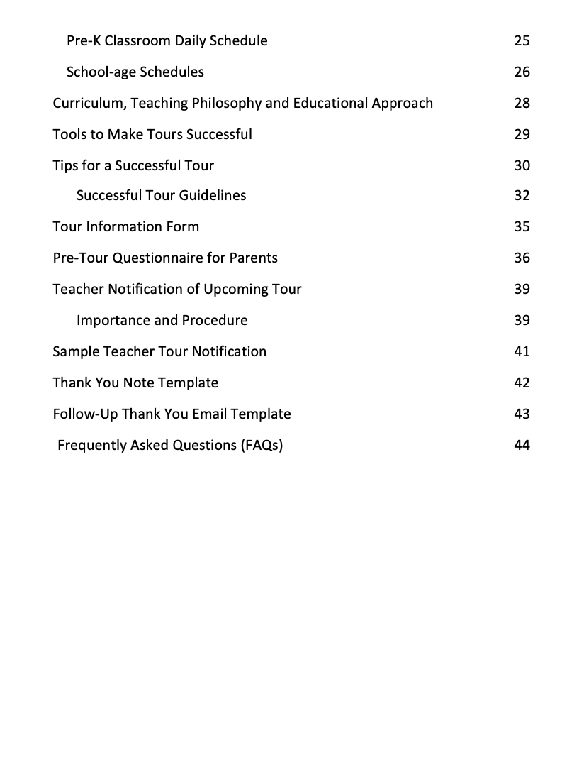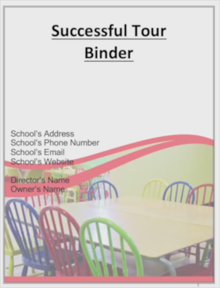 The childcare tour binder is a comprehensive resource designed to support directors in conducting successful and informative tours for prospective families. It includes a variety of essential materials, such as pre-tour survey forms to gather information about prospective families, guidelines for conducting engaging and informative tours, checklists for collecting enrollment and contact information, and a FAQ sheet to address common questions from parents. Additionally, the binder contains detailed information about our programs and services, facility layout and amenities, and staff profiles. With this comprehensive toolkit at their disposal, directors can confidently showcase their childcare center's values, programs, and facilities, providing prospective families with a personalized and informative tour experience.