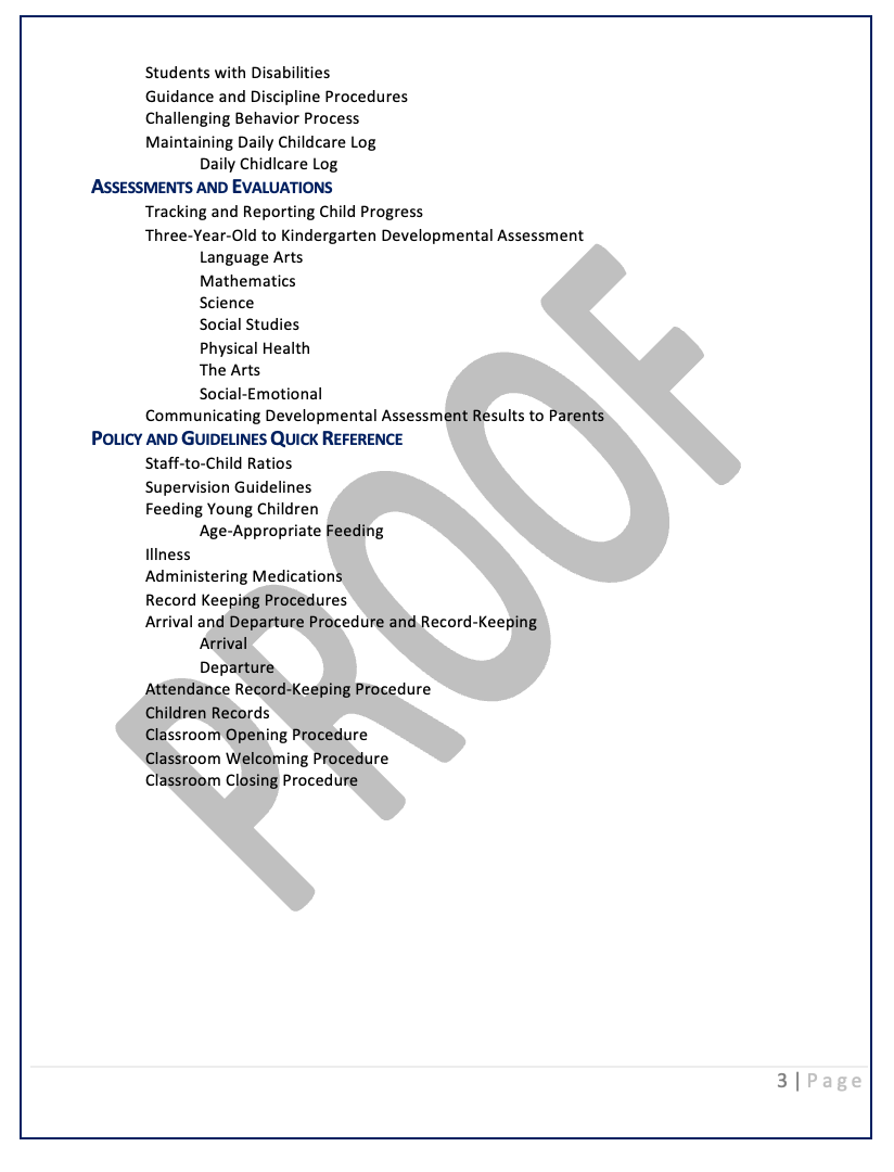 Procedures for handling illnesses, administering medications, record-keeping, and opening, welcoming, and closing the classroom.