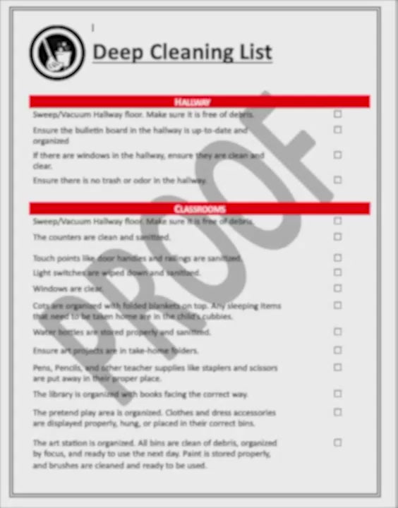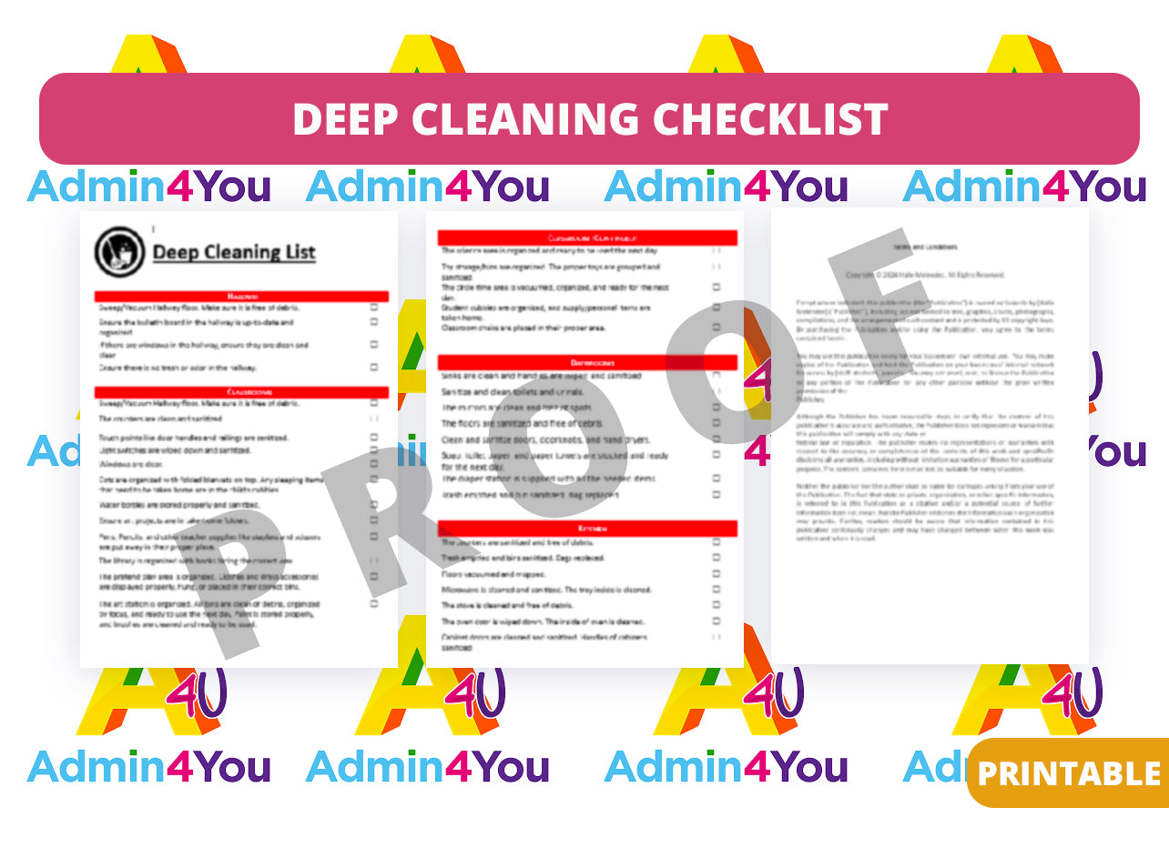 The deep cleaning checklist is a tool to use to keep the school organized, clean, and sanitized! This checklist will help your staff stay on task and the school sparkling!