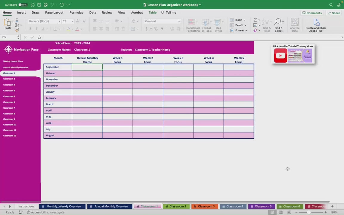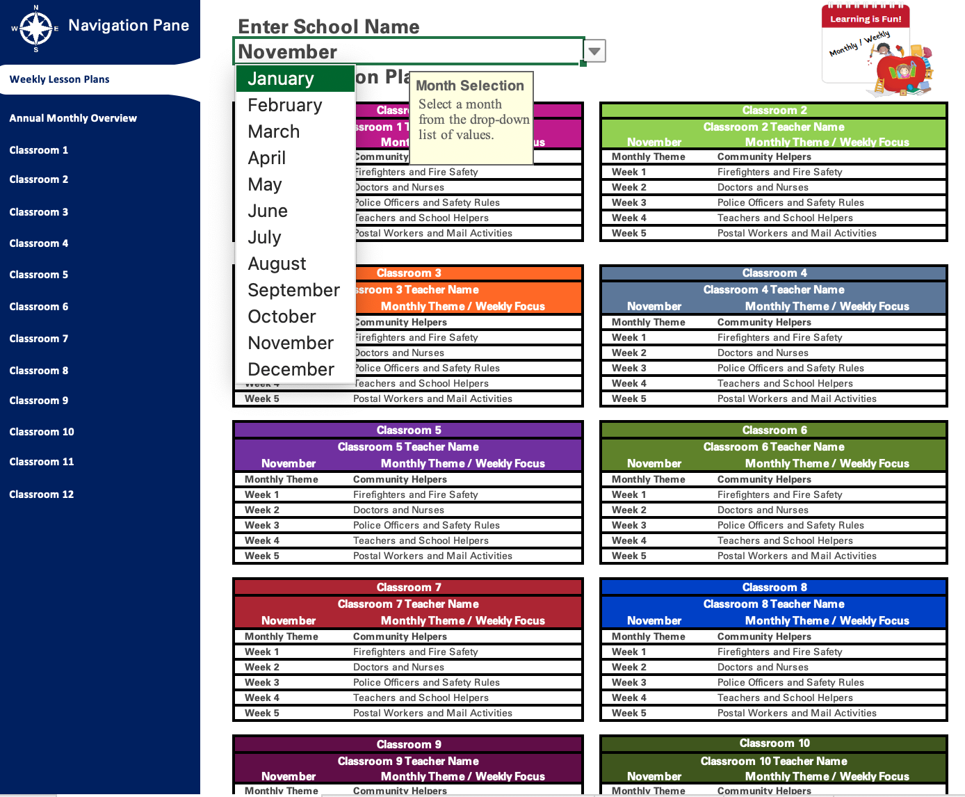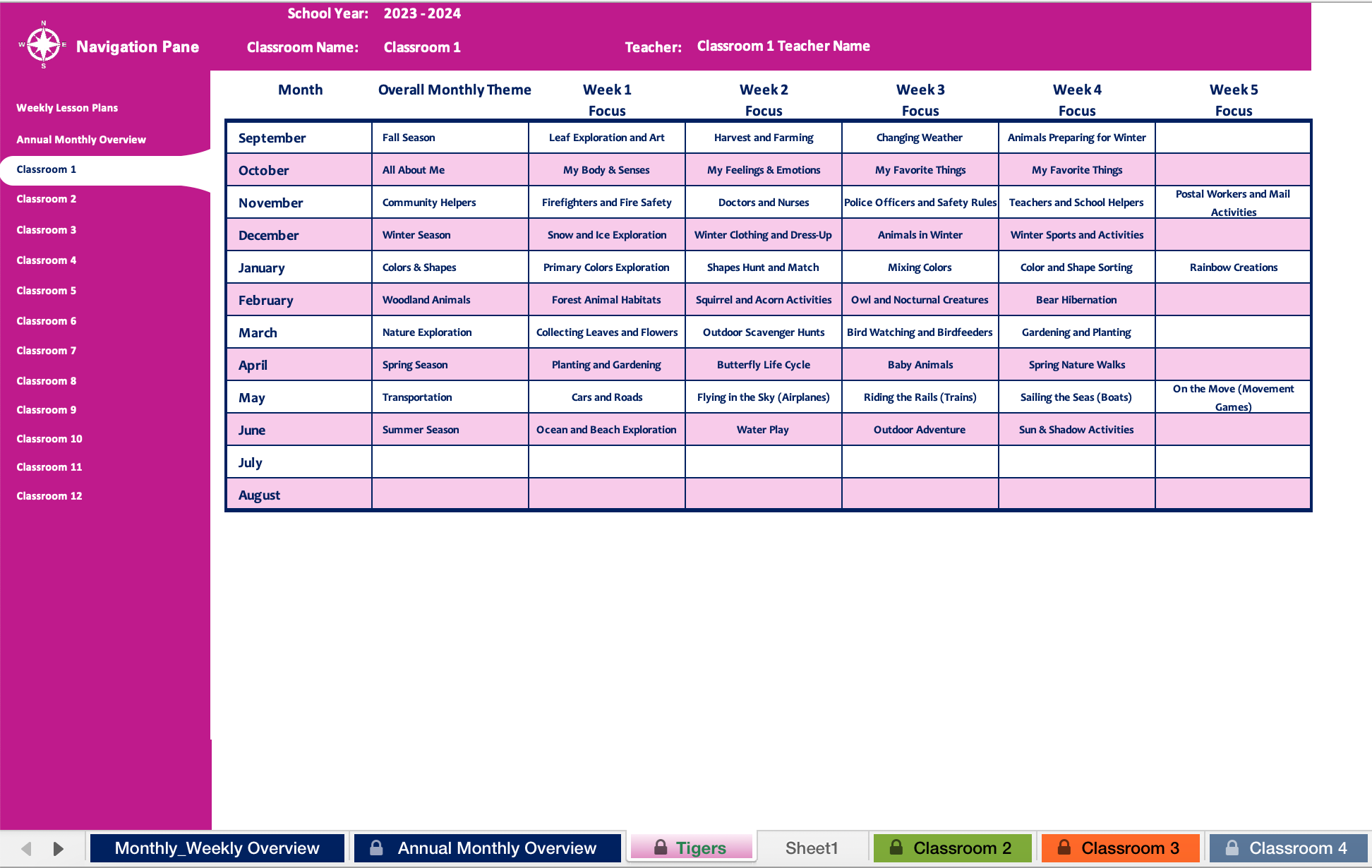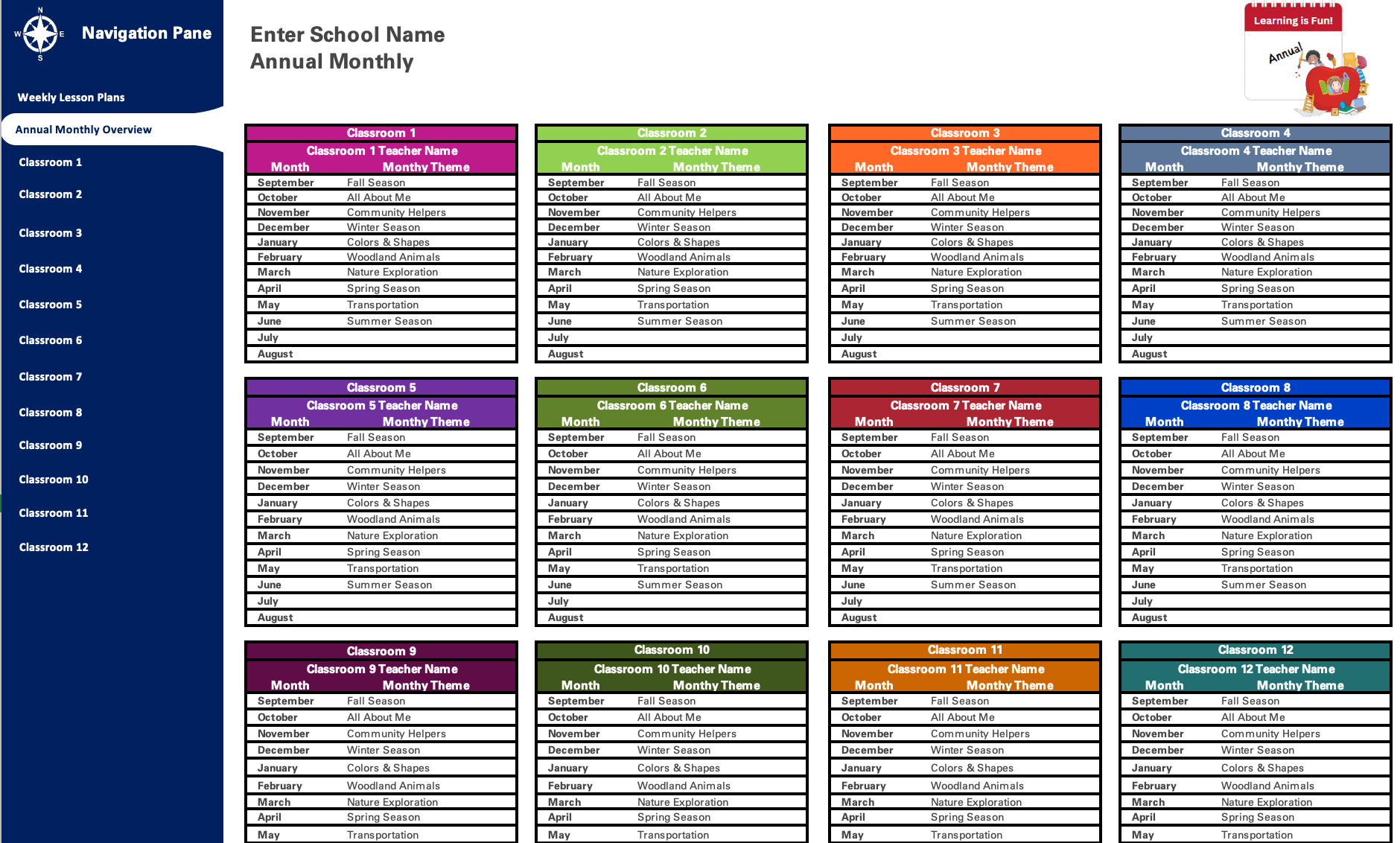 - Multi-Classroom Capacity: Accommodate up to 12 classrooms within a single, organized Excel workbook, ensuring seamless management of diverse lesson plans.