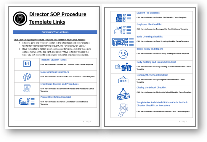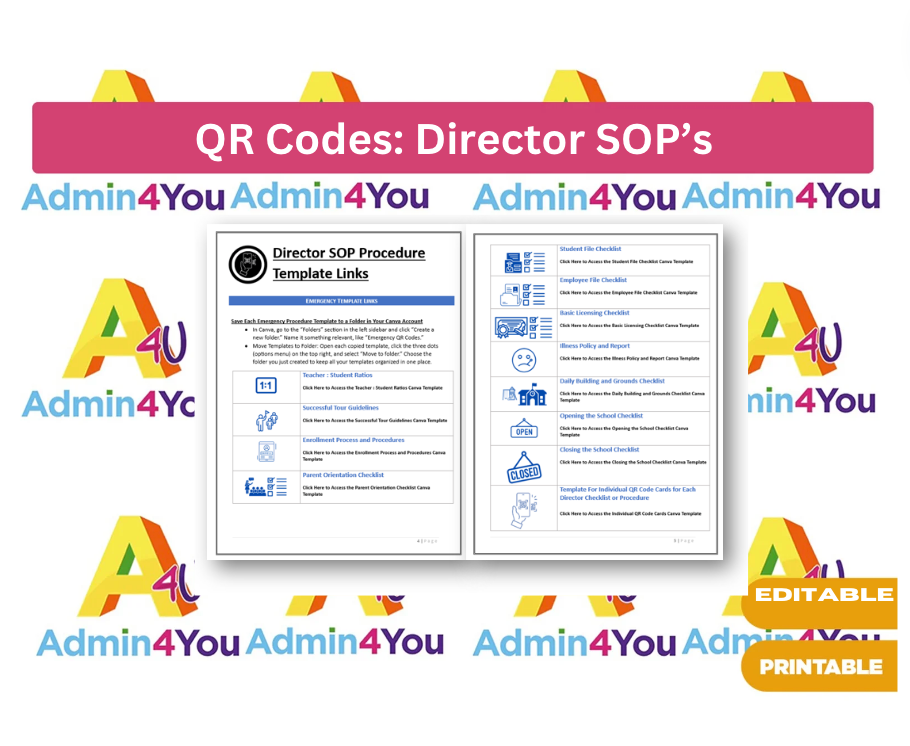 Welcome to the Director SOPs Procedures QR Code Resource Manual. This guide has been designed to help childcare directors efficiently manage and communicate procedures within their centers. With easy-to-use Canva templates, step-by-step instructions, and QR code integration, this resource ensures that your staff can access and follow critical procedures quickly and efficiently.