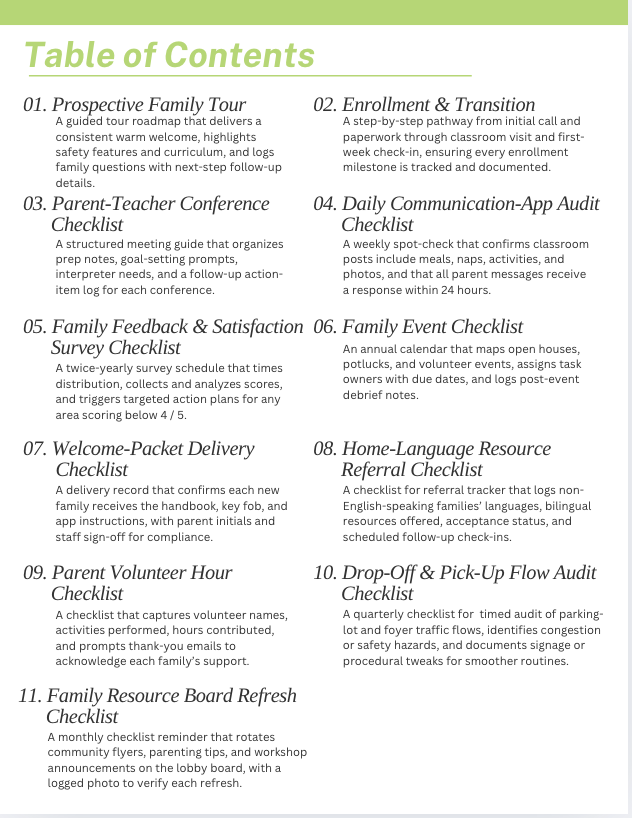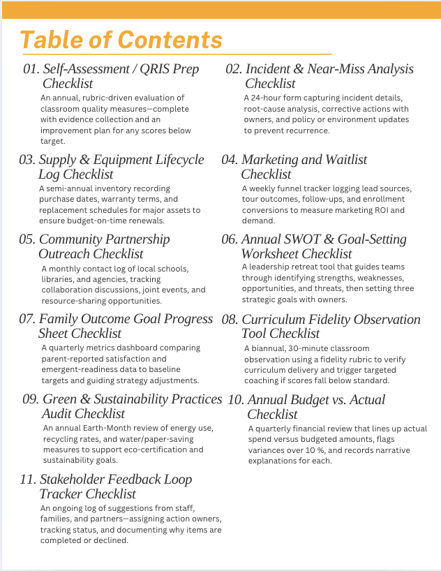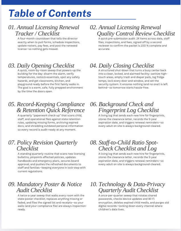 · Annual Licensing Renewal Checklist and Tracker: A four-month countdown that tells the director exactly when to pull forms, schedule inspections, update rosters, pay fees, and post the renewed license—so nothing gets missed.