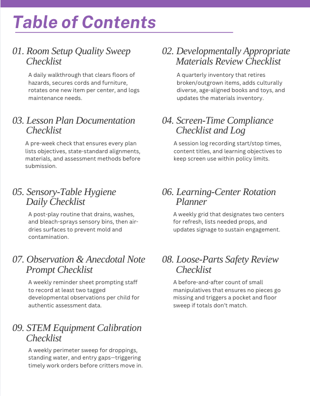 · Room Setup Quality Sweep: A daily walkthrough that clears floors of hazards, secures cords and furniture, rotates one new item per center, and logs maintenance needs.