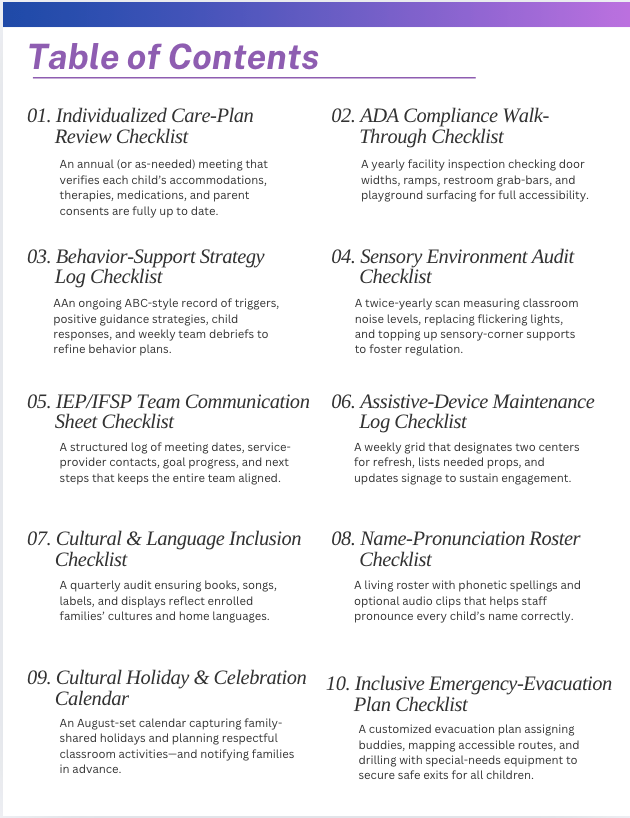 · Cultural & Language Inclusion Checklist: A quarterly audit ensuring books, songs, labels, and displays reflect enrolled families’ cultures and home languages.