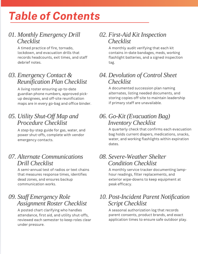 · Monthly Emergency Drill Checklist: A timed practice of fire, tornado, lockdown, and evacuation drills that records headcounts, exit times, and staff debrief notes.
