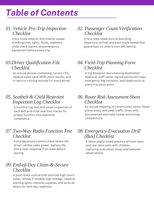 · Emergency-Evacuation Drill (Bus) Log Checklist: A twice-yearly timed practice of front-door and rear-door exits with children, capturing evacuation times and behavior observations.