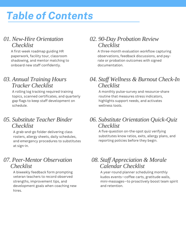· New-Hire Orientation: A first-week roadmap guiding HR paperwork, facility tour, classroom shadowing, and mentor matching to onboard new staff confidently.