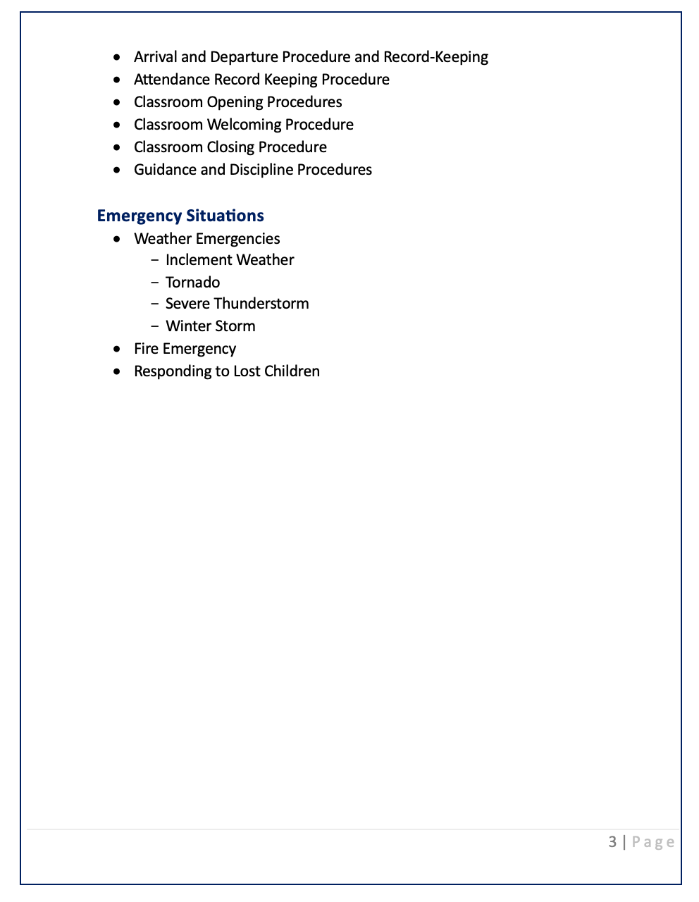 Detailed information on handling various emergencies, including weather emergencies (inclement weather, tornado, severe thunderstorm, winter storm), fire emergencies, and responding to lost children.
