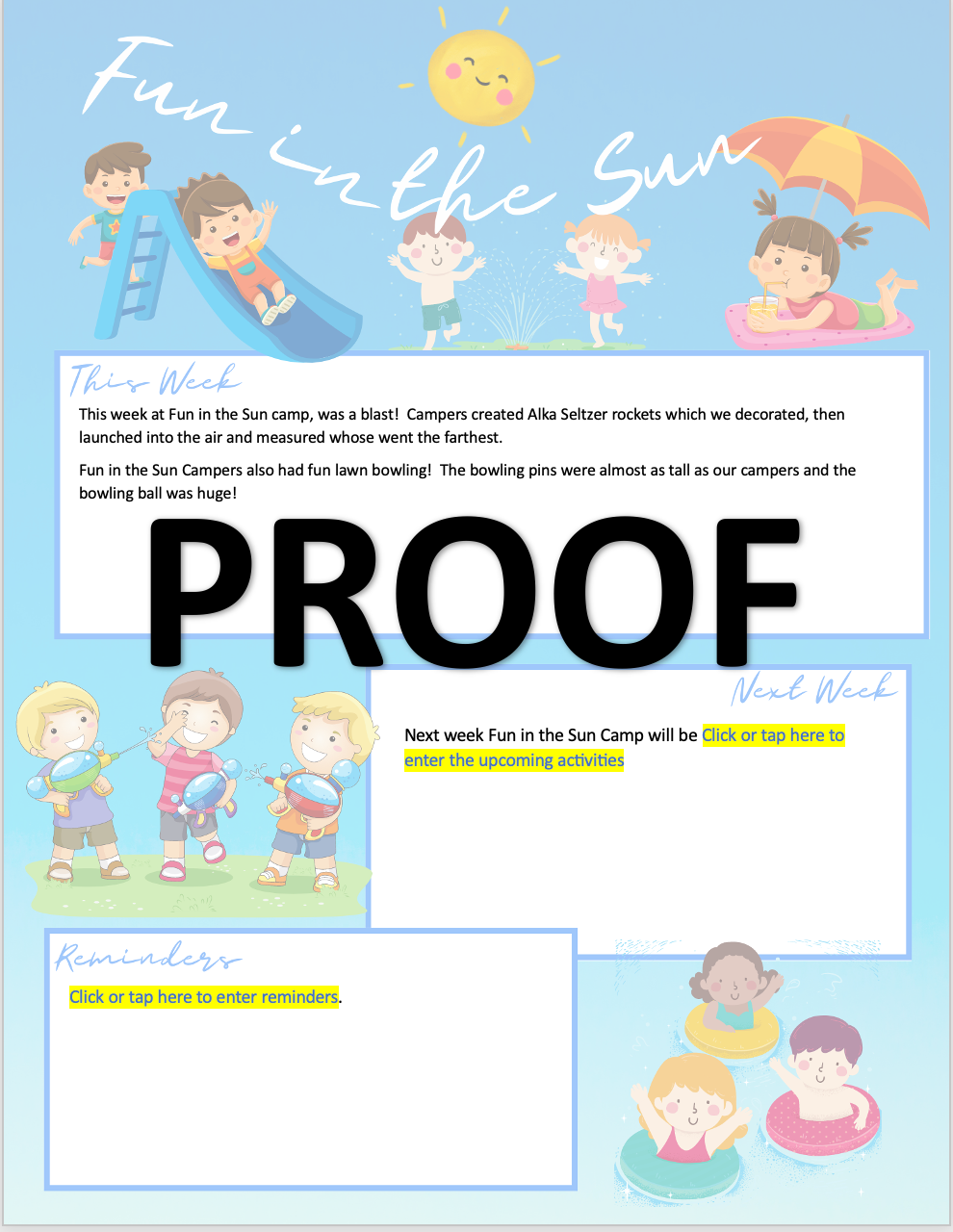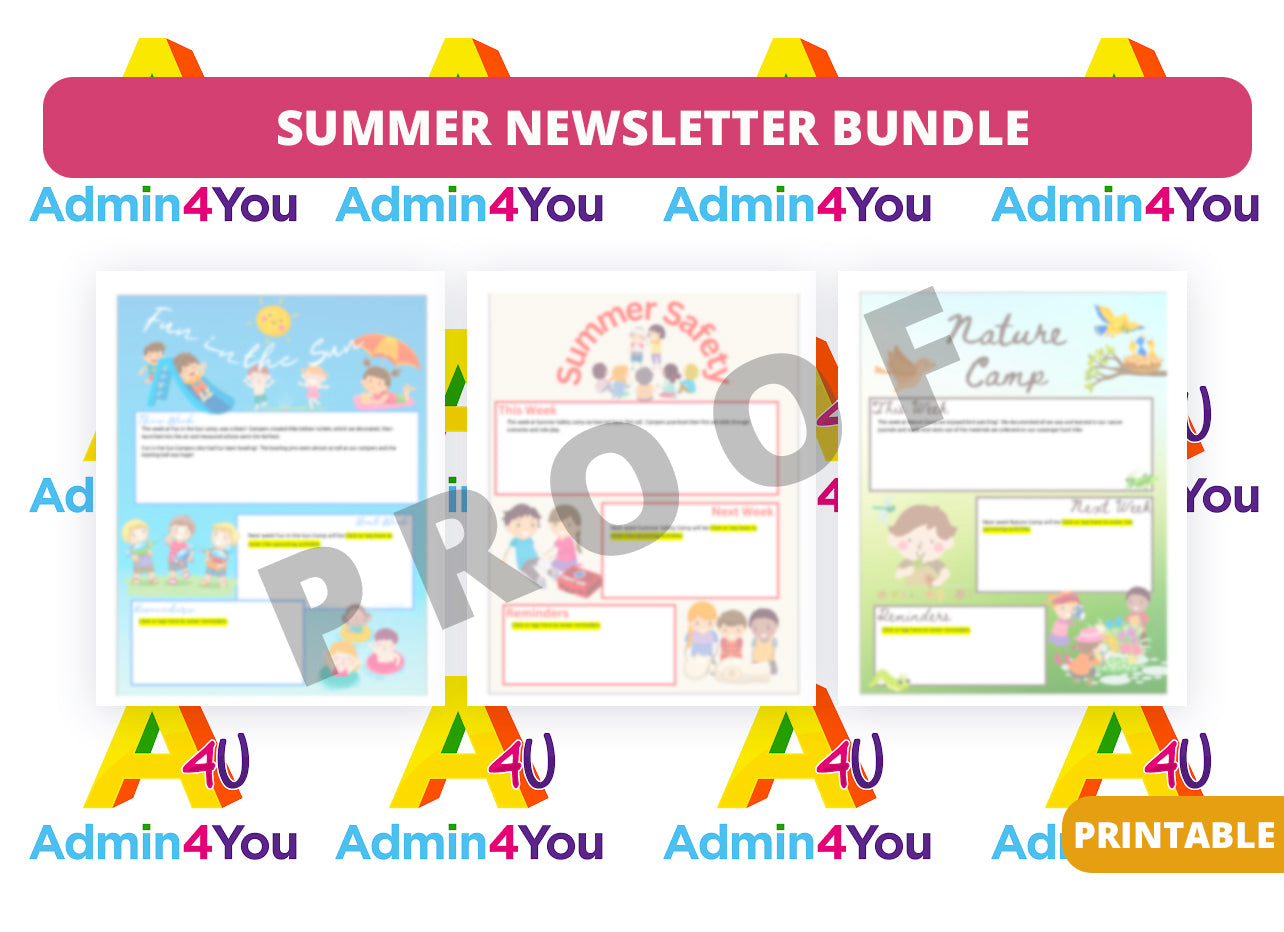 This is the complete set of 13 weeks of newsletter templates for the summer. These ready-to-use summer newsletters are fabulous to notify parents of the summer plans at your school. This complete set correlates with our summer program plans for each age group! These weekly-themed newsletters are editable to add details about the past week in your classrooms. The newsletters have a beautiful and appealing layout and are so easy to use!