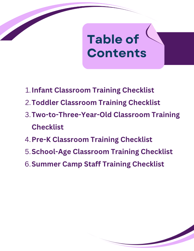 High-quality training is the foundation of classroom success. This training checklist packet is designed to ensure every staff member receives thorough, consistent, and classroom-specific onboarding. Each section aligns with your classroom's responsibilities and meets local and state licensing standards.
